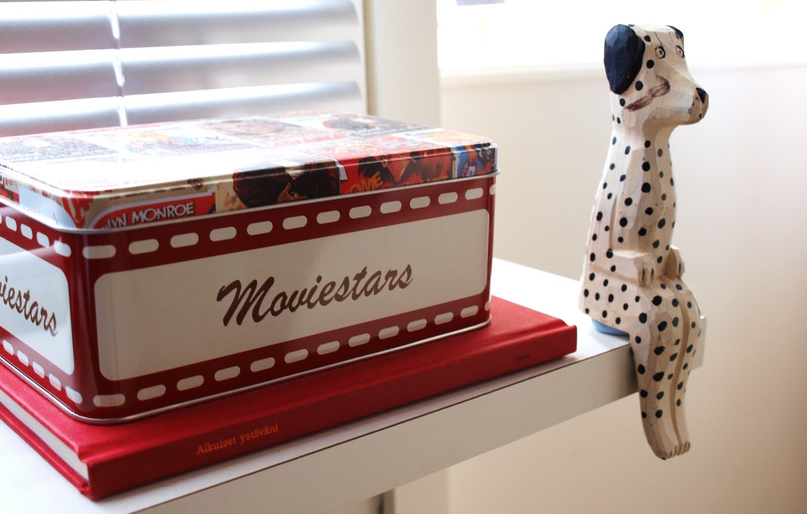 Koira on kiinnitetty olohuoneen ikkunalaudalle sinitarralla sen oman turvallisuuden vuoksi. Kerran puinen otus kolahti M:n siskonpojan päähän ja kerran jos toisenkin on Eppu napannut lajitoverin lelukoppaansa. Dalmatialainen on 20 sentin kirpparilöytö, jota ei vain voinut ohittaa. Moviestars- keksirasia on ”häälahja” ystävältäni Ainolta; juhlimme Victorian & Danielin häitä keksejä napostellen. Aikuiset ystäväni-kirja on sekin kirpputorilta, ja tuo mieleen ala-aste-ajan ystäväkirjojen täyttämiset välitunneilla. Hei mitä sä harrastat? Mikä sun lempileffa on?