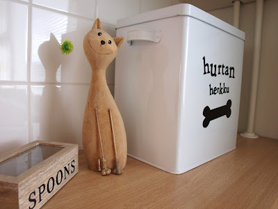 Keittiön nurkassa kököttää Epun lempiesine. M oli aikoinaan minulle vihainen, kun ostin viisi kiloa painavalle taskukoiralle ruoka-astian, jonka sisällöllä syöttäisi koko lähitienoon koirat, mutta onhan se nyt vaan myönnettävä, että boxi toimii kivana katseenvangitsijana. Pikkukisu on pieni kunnianosoitus edesmenneen mummuni edesmenneelle kissalle, joka maukui kunnioitettavan 18 vuoden ajan. Minä sain parivuotiaana kunnian nimetä kissan Hessuksi.