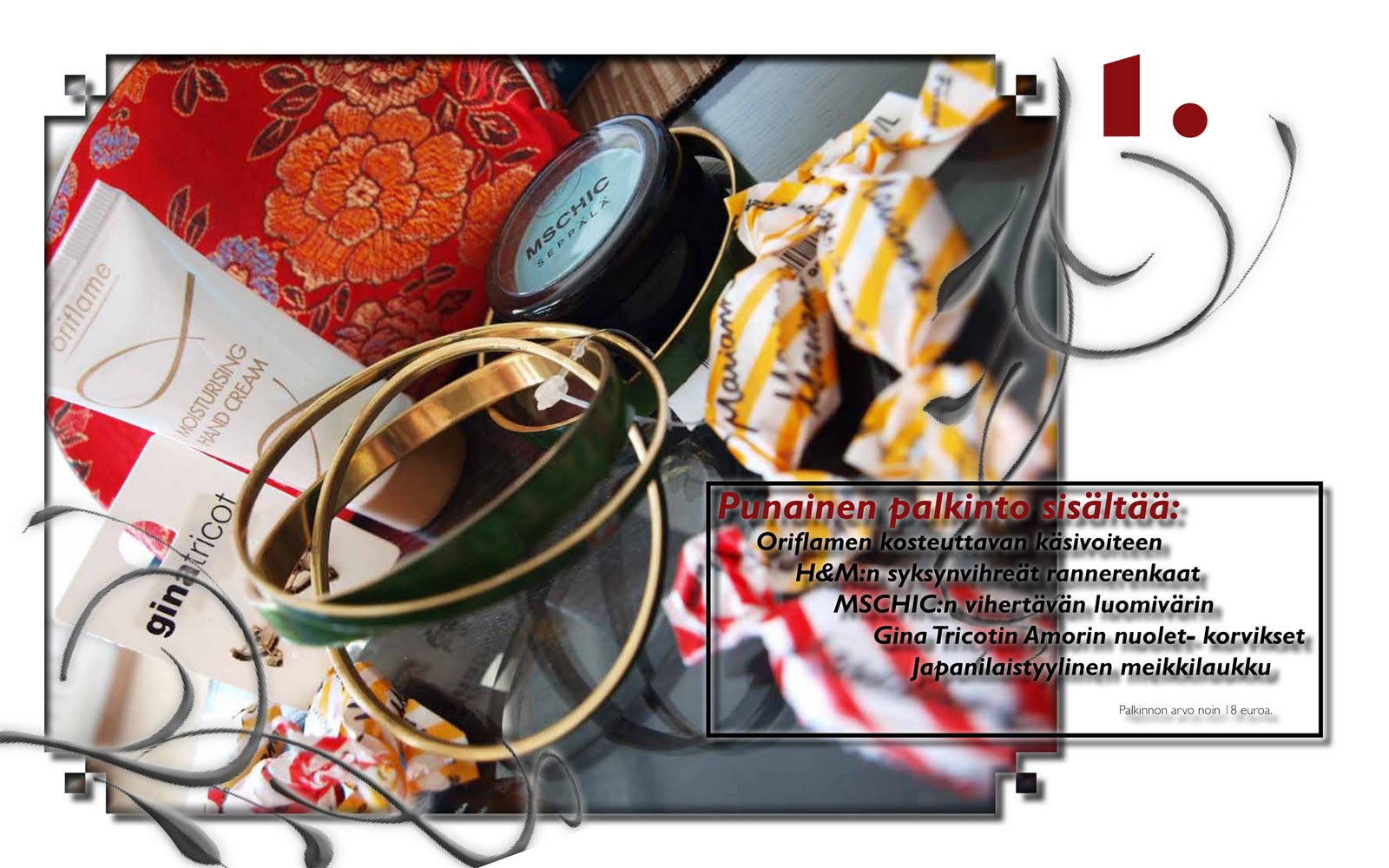 Ensimmäinen palkinto sisältää kauniiseen japanilaishenkiseen meikkipussiin pakattuna Gina Tricotin Amorin nuoli-korvikset, Hennesin rannerenkaat, Seppälän vihertävän luomivärin ja Oriflamen kosteuttavan käsirasvan. Palkinnon arvo on noin 18 euroa.