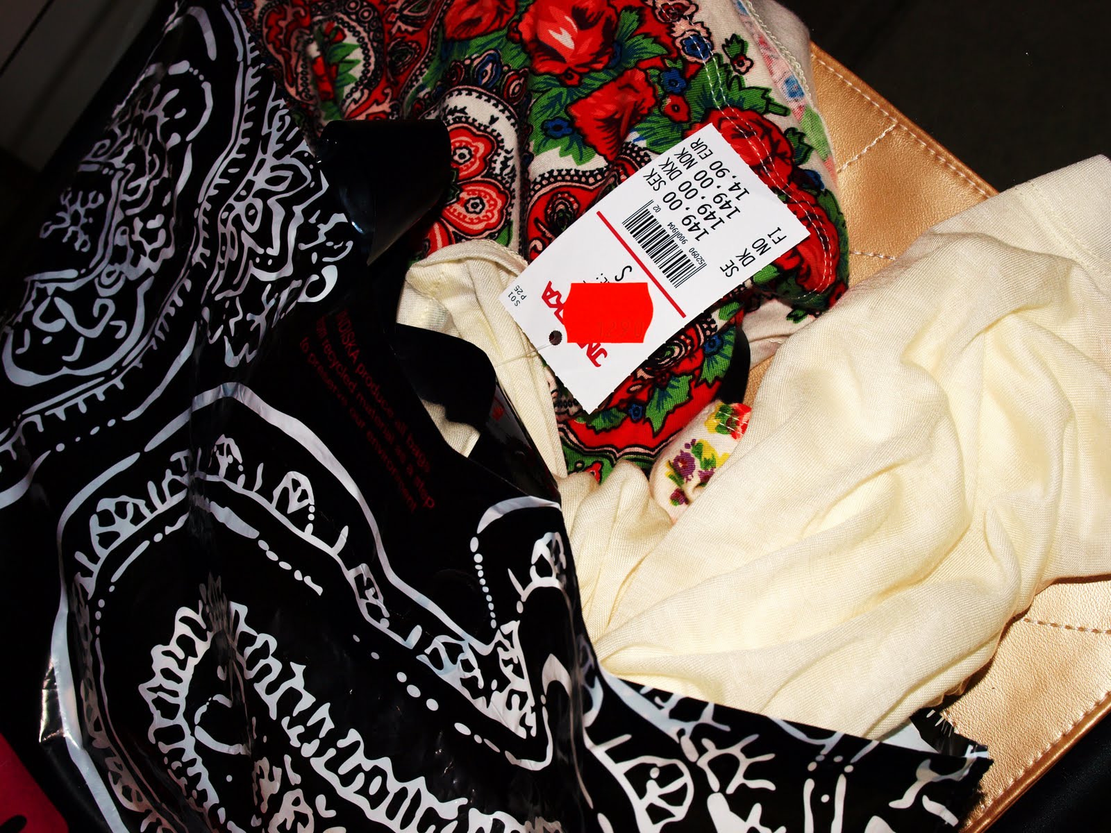Rakastan tuon uuden tunikan värejä. Ne ovat niin kirkkaat ja raikkaat, että tunika herätti huomioni vaaterekistä pelkästään kuvioinnillaan. Tunikan lähtöhinta oli kolmenkymmenen euron tienoilla, siitä se oli pudotettu 25 euroon, ja nyt kun alehinnatkin oli pistetty puoliksi, tuo ihastuttava ruususen unelma lähti tulijaisiksi Tampereelle noin 12 euron hintaan. Löytö! :)