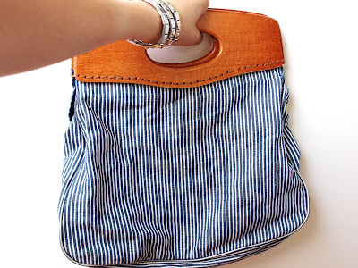 H&M:n raitalaukku on kuin seiloritytöltä pöllitty. Laukku on täysin uuden veroinen. Kopisevat puuosat ovat hieman kuluneet (mutta eivätkö olekin kauniin väriset!), mutta asustaahan mulla täällä toi iloinen pikku puuseppä, joka varmaan mielellään ne hioo ja laittaa kuntoon. Puuöljyä pintaan ja menoks ;). Hintaa mun uudella lempi pikkulaukulla oli 1 euro. Siis 100 senttiä. Eli juuri sen verran, kun mielelläni kirppariostoksesta maksan.