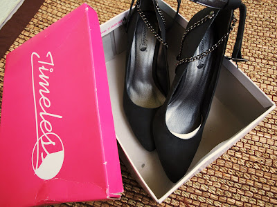Kuvittelen aina välillä, että herään ehkäpä jonakin päivänä ja huomaan, että ohhoh, minähän osaan kävellä korkkareilla. Rakastan korkokenkiä, tarkemmin sanottuna, mielestäni ne ovat kauniita ja viehättäviä, mutta niitä ei ole tehty minulle. En tiedä mitä niillä pitäisi tehdä. Nämä Timelessin korkkarit halusin kuitenkin edullisen hinnan ja ihastuttavan ketjuyksityiskohdan vuoksi. Ai olenko käyttänyt? No, niinkuin näette, kärjestä pilkistää vielä pahvituki.