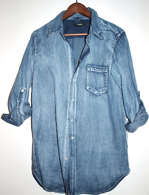 Paita näyttää noin henkarissa kuvattuna pikemminkin kammottavalta, mutta se täyttää kaikki hyvän ja käytännöllisen denim-paidan kriteerit: pehmoista farkkua, upean värinen, peittää pepun ja soveltuu täten legginssikäyttöön eikä hintakaan alennusmyynneissä ollut kova.