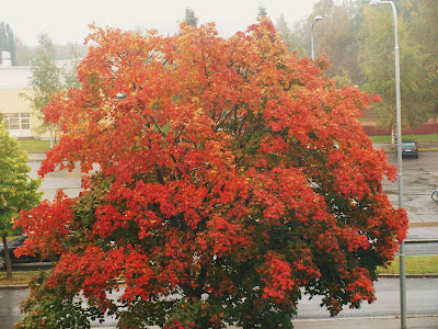 Huomenta. Meidän keittiön ikkunasta näkyy maailman upein vaahteranlehtipuu. Koko lähiseudulta ei löydy vielä yhtä punastunutta vaahteraa, oikeastaan kaikki muut puut ovat vielä vihreässä lehdessä. Siinä se jököttää ja toivottaa meille hyvää huomenta aamuisin, jopa tälläisinä harmaina sadeaamuina.