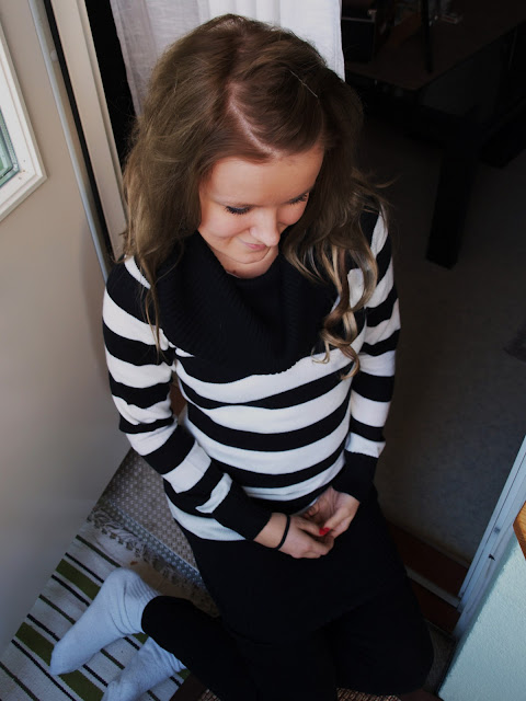 Club L:n merihenkinen neuletakki, jonka kuviointina on muuten RAITAA (ihan vaan jos ette huomannut), oli kaikessa yksinkertaisuudessaan hyvä pari mustille leggareille ja H&M:n saappaille. Aleksi 13:n huivi vaihtui tosin vielä lähdön hetkellä lämpimämpään henkkamaukan huiviin, mutta tulipahan nyt tuokin kuvattua. Kaunis printti, ja ihanan pehmoista satiinisilkkiwhatevermateriaalia ;)