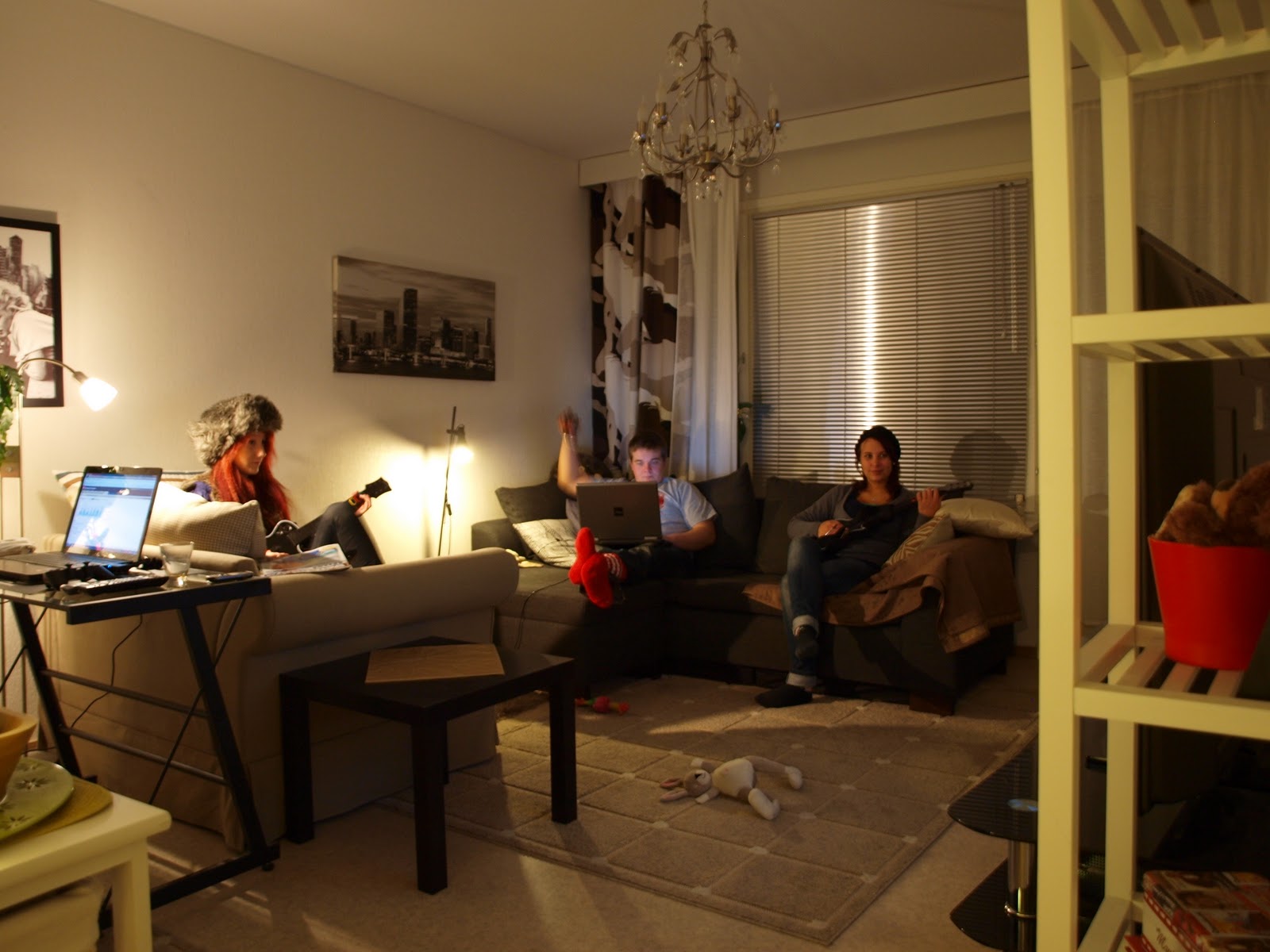 Roosa hurmasi koko juhlaväen pehmoisella päähineellään (jonka itse asiassa minä olen ostanut viime jouluna iskälle H&M:ltä sisäpiirivitsinä). Ja siis juhlaväkeähän oli melkoisesti, juuri ja juuri istumapaikat riittivät kaikille ;) Anna tuli haastamaan synttärisankarin Guitar Herossa, ja käväisihän ihana mummelinikin tuomassa Matille lämpimän paketin.