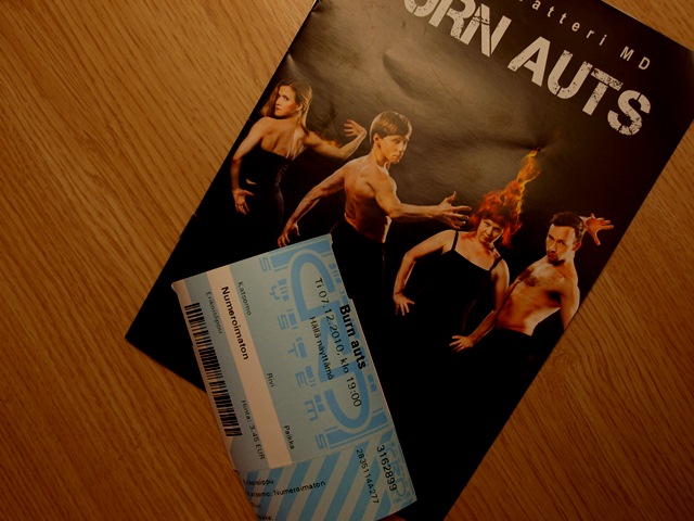Anna tutustutti minut tänään tanssiteatterin saloihin, ja kokemus oli … jännä. On ihanaa istua teatterin penkissä ilman mitään odotuksia, koska silloin ei voi pahasti pettyäkään. Mutta, kun jo ennen esitystä näyttelijät juoksevat huohottaen ja käsiään heilutellen odotustilaan, pitävät kummallista älämölyä ja tunnelma on jotenkin kovin kovin ahdistava, en oikein tiedä miten päin pitäisi olla. Itse menen teatteriin viihtymään, nauramaan ja taputtamaan. Kyseinen näytelmä oli ihan toisenlainen. Kantaaottava ja aiheenaan työuupumus. Loppujen lopuksi kokemus oli kuitenkin kovin myönteinen. Tärkeästä asiasta voi sitten ilmeisesti puhua tanssinkin keinoin. Kyllä mä silti ajattelin katsoa vielä Tuurin tämän iltaisen jakson kuitenkin kovalevyltä, että pääsee sitten mukavin ajatuksin nukkumaan :D