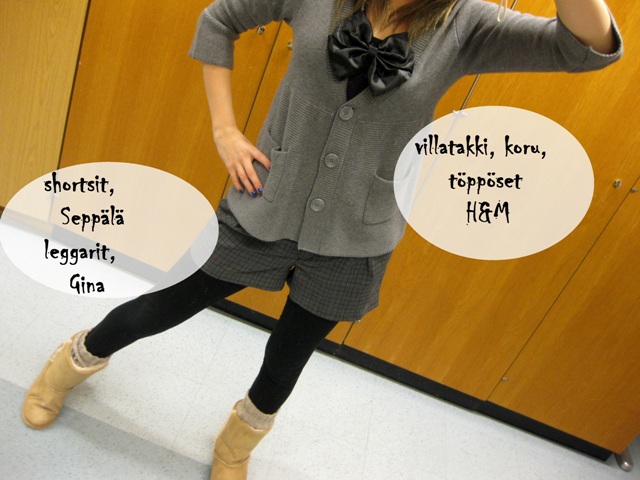 Vaikka shortsikelit ovat nyt ehkä kenties tältä vuodelta ohi, voi ne pariuttaa Gina Tricotin ihanan paksujen leggareiden kanssa, ja taas tarkenee! Hennesin villatakkiakaan en ole tainnut vielä blogin puolella esitellä, mutta se onkin jo melko iäkäs hankinta. Asun villasukat ovat made by muori, ja ne ovat töppösistä vilkkuneet jo uuuuseasta asukuvasta. Pitäisiköhän laittaa toisenväriset tilaukseen, etteivät lukijat kyllästy (tai sitten välillä pölliä Matin joulunpunaiset sukat lainaan) .. ;)