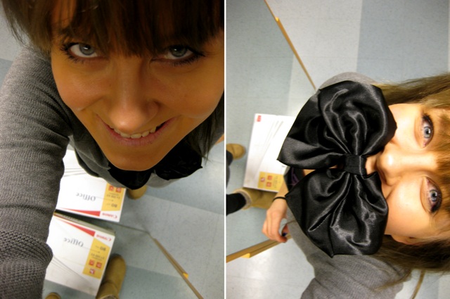 Mulla on tänään hieman överimäinen asuste kaulassa. Hennesin rusetti roikkuu hopeisessa kettingissä juuri sopivasti siinä, missä villatakin napit alkavat. Rakastan tuota korua, ihan höpsöhän se on, mutta onneksi töissäkään ei aina tarvitse pukeutua tylsästi, vaan asusteilla voi asuihin tuoda pikkuisen särmää ja esitellä täten omaa persoonallisuutta.