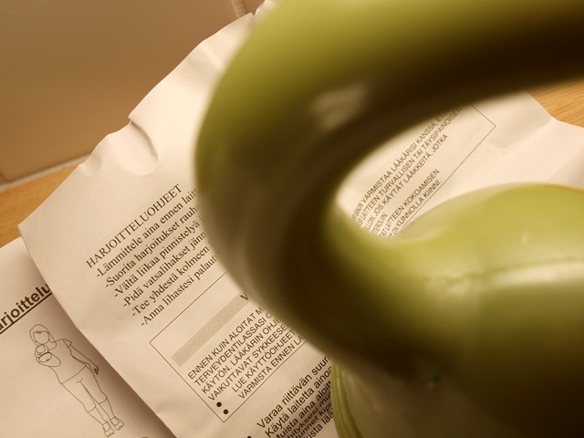 Tein äsken noin 20 minuutin reenin kuulan mukana tulleilla ohjeilla ja ette te kuitenkaan tätä usko, mutta heti helpotti. Mun niskoissa napsui ja paukkui, hartiat oli ihan tulessa (ne ei verenkiertoo ollut hetkeen nähneetkään) ja mun tuli hiki. Jos liikunta on näin helppoa ja jos tuloksia syntyy näin nopeasti, mä en lopeta tätä hommaa ikinä. Sitä paitsi toi on niin paljon esteettisesti kauniimpi jumppaväline, kun joku käsipaino nurkassa ;)