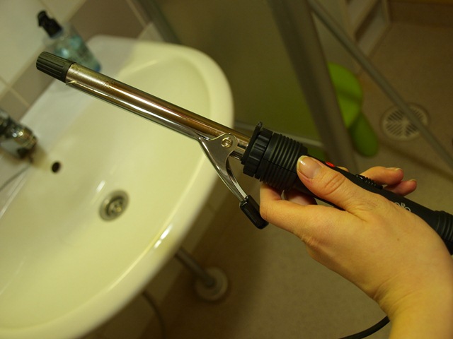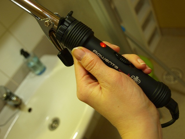 Kihararautana käytän Rowentan Elite- sarjan rautaa, joka on toiminut kuin unelma jo monen vuoden ajan (kiitos Roosa! ;). Kyseiseen rautaan on olemassa myös monia erilaisia vaihtopäitä, mutta tällä kertaa sileä rauta sopii parhaiten tarkoitukseen. Eli rauta lämpiämään ja sitten kihartamaan! ;)