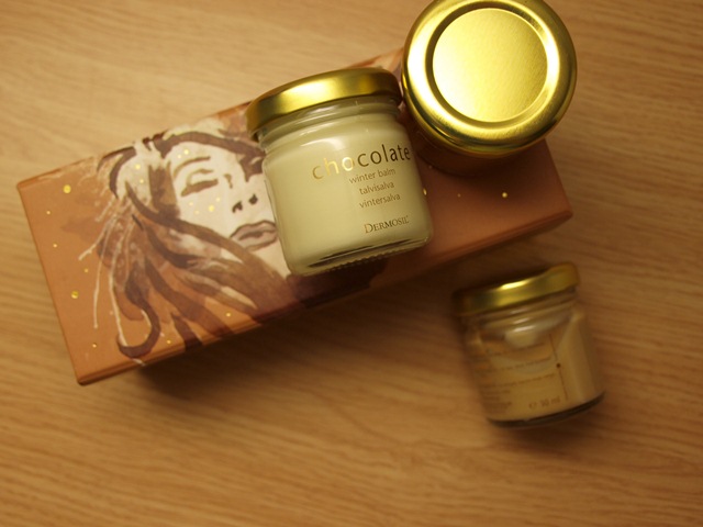 3. Dermosilin suloisen suklaisesta pakkauksesta löyyi kolme eri purnukkaa, jotka sisälsivä muun muassa talvisalvan sekä kasvonaamion. Nam nam.