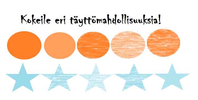 Nyt tekstit ovat paikoillaan, ja voitkin alkaa leikkiä erilaisilla muodoilla. Paintista löytyy monia erilaisia muotoja (palloja, tähtiä, sydämiä..), joilla saat rakennettua kollaasiisi eloa. Muodon täyttö- ja ääriviivakohtia testailemalla voit muuttaa ja muokata muodon väriä ja ääriviivojen väriä. Ääriviivojen ja sisällön värit valitaan aktiiviseksi värikartan vieressä näkyviin neliönmallisiin väripainikkeisiin, valitsemalla värivaihtoehdoista. Alla olevasta esimerkistä näet, miten väri muuttuu näitä painikkeita käyttämällä.