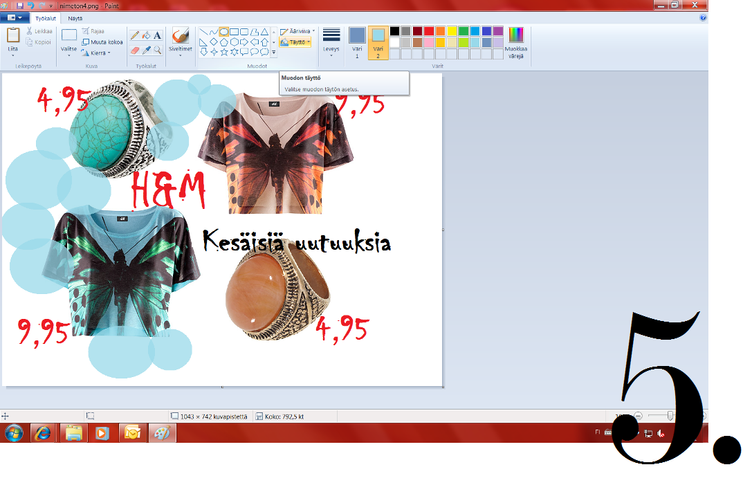 Nyt tekstit ovat paikoillaan, ja voitkin alkaa leikkiä erilaisilla muodoilla. Paintista löytyy monia erilaisia muotoja (palloja, tähtiä, sydämiä..), joilla saat rakennettua kollaasiisi eloa. Muodon täyttö- ja ääriviivakohtia testailemalla voit muuttaa ja muokata muodon väriä ja ääriviivojen väriä. Ääriviivojen ja sisällön värit valitaan aktiiviseksi värikartan vieressä näkyviin neliönmallisiin väripainikkeisiin, valitsemalla värivaihtoehdoista. Alla olevasta esimerkistä näet, miten väri muuttuu näitä painikkeita käyttämällä.