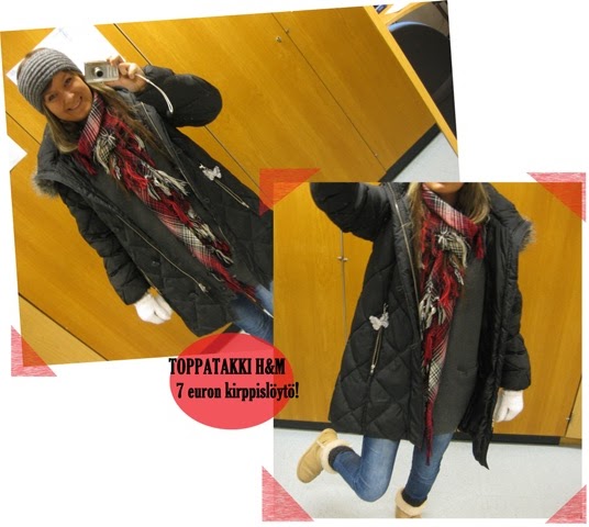 Pakkaset ei oo mun juttu, mulla menee vilunväreet jo pelkästä siitä lumen natisevasta äänestä kenkien alla, ja vihaan sitä, kun tuuli ja viima änkee paksuistakin kerroksista huolimatta takin koloista sisään. Tuo Hennesin kirppistakkilöytö on kuitenkin ehdottomasti paras kirppislöytöni ikinä. Se on jo monenkertaisesti maksanut itsensä takaisin, ja pelastanut muun muassa mun häntäluun kahdesti :D