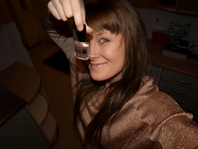Löysin säteilevään neuleeseeni sopivan kynsilakan poistomyynnistä. Maybellinen Forever Strong Pro- lakka (sävy 810 Chic Gold) kuuluu tosin jo Maybellinen poistuviin sävyihin ilmeisestikin, sillä hintaa lakalla ei ollut kuin hieman yli euron. Toivottavasti se riittää niin kauan kuin neulekin on käyttökelpoinen. Näitä kaveruksia on näet pakko käyttää yhdessä. Kun kultaa ja kimallusta on kynsissä ja paidassa, muita koruja ei juuri tarvitakaan.