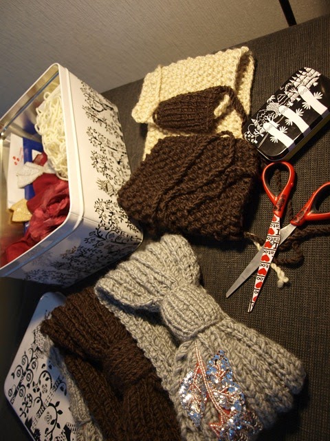 Huomenna myyntiin paukahtaakin sitten itsetekemiäni villapantoja, joita muutama teistä on jo tiedustellutkin. Tällä hetkellä valmiina on kaksi kappaletta harmaita paljettikoristeella koristeltuja pantoja, yksi perusruskea panta ja paksumpi vaalea panta. Huomenna kaikki sitten tarkkana, jotka pantoja halajavat! ;)