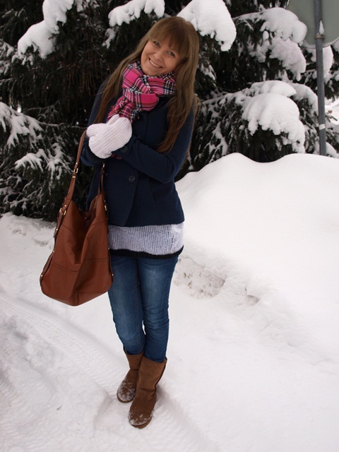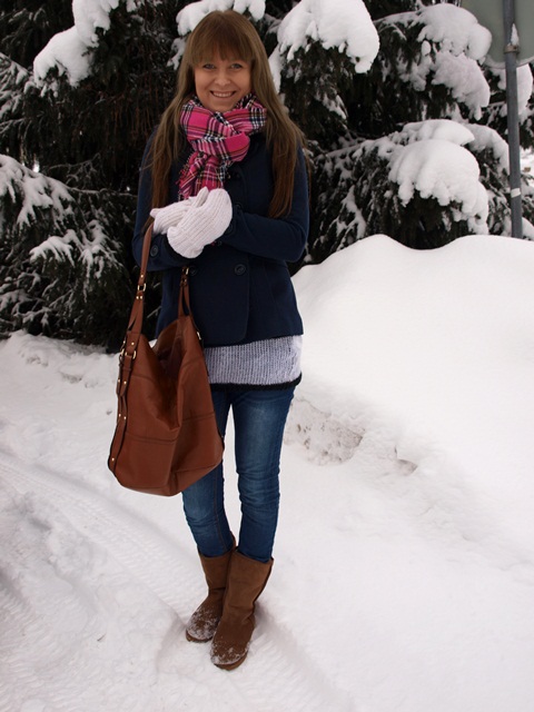 Kun nyt kerrankin olin valoisaan aikaan tuon hovikuvaajan kanssa samassa paikassa, napsaistiin pitkästä aikaa hieman valoisammat asukuvatkin kuusen katveessa :D Niinpä; tuon takin piti olla hieman keväisemmille keleille, mutta pitihän se nyt käytännössäkin testata. Sinisen takin kanssa yhdistin pinkin Gina Tricotin huivin, H&M:n ruskeat töppöset ja laukun ja Onlyn farkut. Takin alta pilkistelee Serious Sallyn neule.