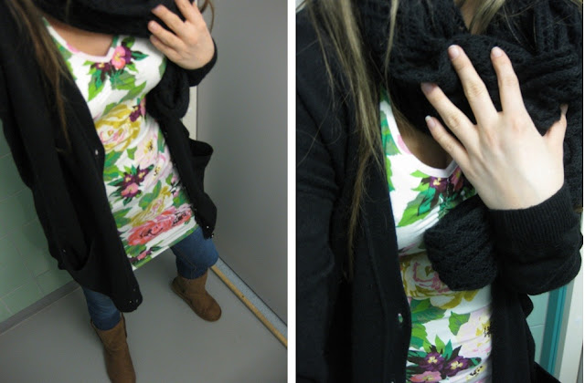 Tänään ruusuinen pusero sai parikseen kuitenkin kukkaloistoa neutralisoivan mustan Ginan neuleen, Onlyn farkut ja H&M:n talvikengät.