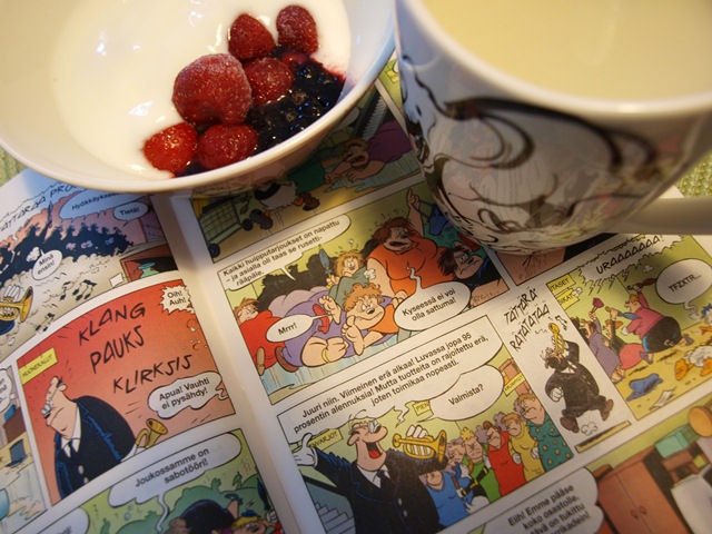 Perjantaiaamu ♥ Kupillinen luonnonjugurttia ja marjoja sekä valkoista teetä. Luvassa on viikonloppu, joka omalla kohdallani kuluu varmaankin askarrellen. Päässä on hirvittävä määrä DIY-ideoita, ja koska tekin olette niitä kaipailleet yritän laittaa bloginkin puolelle sitten lopputuloksia. Pannat saavat nyt painua talviunille, mutta eilen kehittelyyn pääsikin ihan uusi juttu, jonka prototyyppi sai ainakin Matilta paljon kehuja. En sitten tiedä, onko se hyvä vai huono juttu ;)