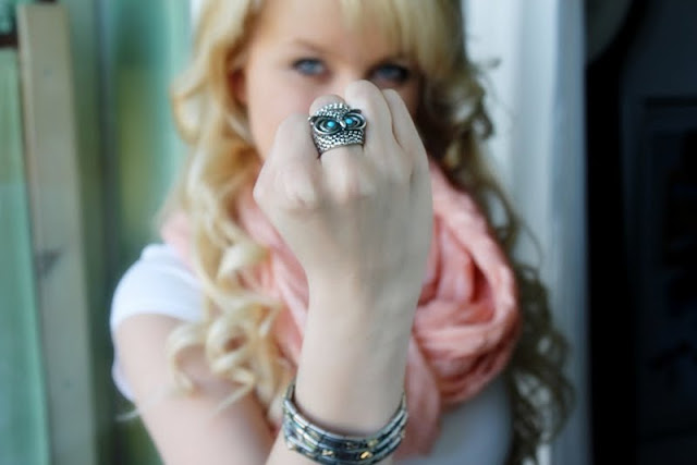 Teidän syytänne, että lopulta minunkin vaatekaappiini päätyi pari chinoja. Ihastelin jo kauan sitten Laapan chinoja hänen blogissaan, ja kun kesähousukokoelmissani oli chinojen mentävä aukko, olivat Seppälästä löytyneet alepökät todellakin järkihankinta. Valkoinen GT:n t-paita hieman peittää kuvissa housujen kaunista yläosaa. Housut eivät malliltaan välttämättä ole parhaat mahdolliset allekirjoittaneen kropalle (ylhäältä sopivat, lantiolta pussittaa), mutta H&M:n ohuen vyön avulla lookista tuli ihan onnistunut.  Saattaa olla, että olen myös hieman ihastunut tuohon persikkaiseen huiviin. Nyt rusketusta viikonloppuna kehiin niin tuokin väri pääsee todella oikeuksiinsa! Vielä lämpimämpiä rakkaustunteita herättää tosin tuo sormessa nököttävä pöllö. ♥