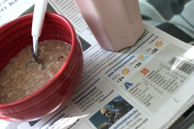 Eppu sai lauantaiaamun kunniaksi uuden lötköpötkölelun, ja itse nautiskelin todellisen terveysaamiaisen. Matti kipaisi kauppaan jo kympiltä, ja päätimme, että tänään valmistetaan ruuaksi kesäherkkuja; uusia perunoita ja silliä, ja jättikulhollinen raikasta fetasalaattia patongin kera. Luvassa on varsin rauhallinen lauantai. Tuo hömelö-miekkoseni on tosin suuntaamassa ulkona pidettävään yösählyturnaukseen (?!?) illalla, ja parhaimmillaan tahkottavana on kuusi peliä. Ei käy kateeks.