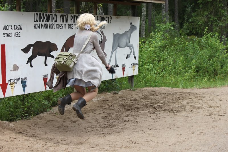 Ähtärin eläinpuisto ja sen asukit on sijoiteltu kolmen kilometrin pituisen reitin varrelle. Eläimiä ihastellessa saa samalla nauttia myös kauniista luonnosta, ja näkyipä reitin varrella myös paljon grillauspaikkoja, joissa olisi voinut makkaransa käristää. Ohjelmaakin puistosta löytyi; Roosa kokeili pystyykö hyppäämään pidemmälle kuin metsämyyrä sillä välin, kun minä ja Matti kisailimme siitä kumpi on pitempi kuin hirvi. Roosa loikkasi kuin saukko ja mää olen lähes karhun korkuinen.
