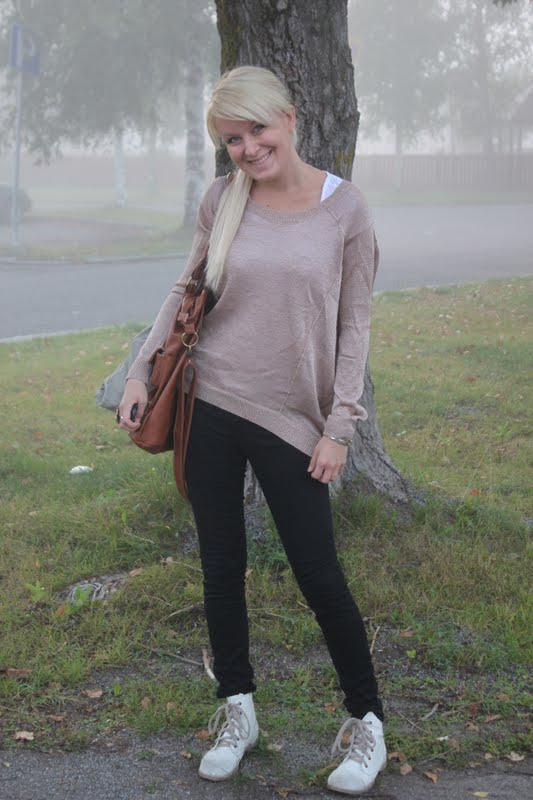 Kas tässä, maailman harmaimmat asukuvat. Maailma oli yön aikana muuttunut kovin harmaaksi. Usvaisen aamun asuuni kuului tällä kertaa Gina Tricotin säihkyvä kultaneuloksinen pusero, parin viikon takaiset kirppispökät (H&M) ja jalkaan pääsivät taas pitkästä aikaa Donna Girlin suloiset vaaleat tyttömaiharit. Hiukset kiinnitin pidennyksineen napakalle ponnarille. Asu on kovin minua ;)