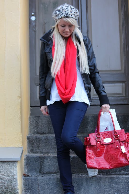 Eilen viettäessäni iltaa Tampereen Muotipäivillä, en kuitenkaan hyljännyt Pukeudu Punaiseen-päivän teemaväriä, vaan piristin muuten kovin tavanomaista asuani pienin punaisin piristein. Unohtamatta tuota kissanaisenbaskeria; ilta alkoi jo hämärtyessään viiletä niin, että jonkinlainen päähine tulikin tarpeeseen. Viimein kaivoin myös käyttöön tuon uuden nahkatakkini. Gina Tricotin punainen tuubihuivi ja O.I.S:n punainen laukku riittivät eilen asusteiksi.