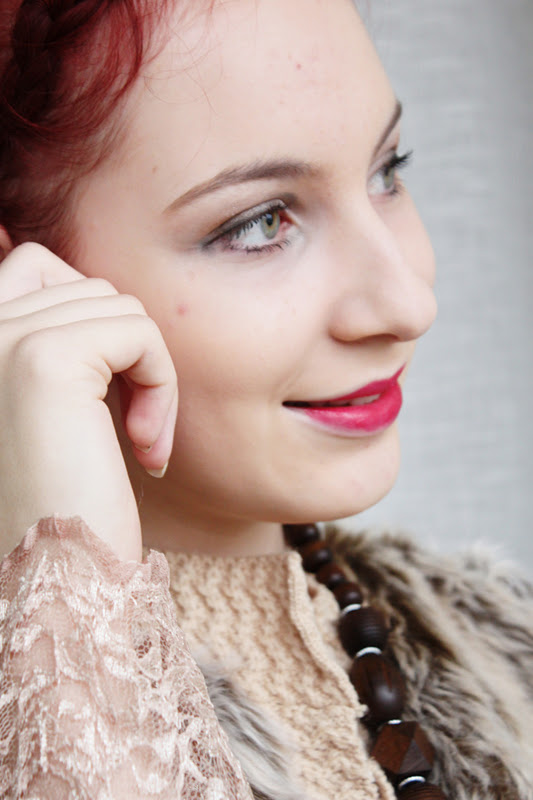Emilian räiskyvän punaiset hiukset nostin korkealle nutturalla päälaelle ja kiinnitin sen pinnien avuin. Etuhiukset sidoimme silmiltä pois kalanruotoletillä. Emilian upeat huulet eivät arkimeikissä kaivanneet muuta piristystä kuin läpinäkyvän huulikiillon. Rohkeampi voi tosin räväyttää kauniilla syksyisellä huulipunalla. Emilialla käytössä alimmassa kuvassa Silk Finish Lipstick sävyä Cherry Frost.