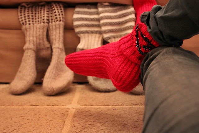 Kävin morjestamassa muoria ja vaaria äsken ja katsokaahan mitä tämä atk-tukihenkilö sai sieltä kotiinviemisiksi.. Kyllä, nyt minulla on ei yhdet, eikä kahdet vaan kolmet maailman parhaimmat made by my muori-villasukat, joita minä ja vilukissailevat varpaani rakastamme yli kaiken. Uusimmat ovat nuo hehkuvan punaiset ♥