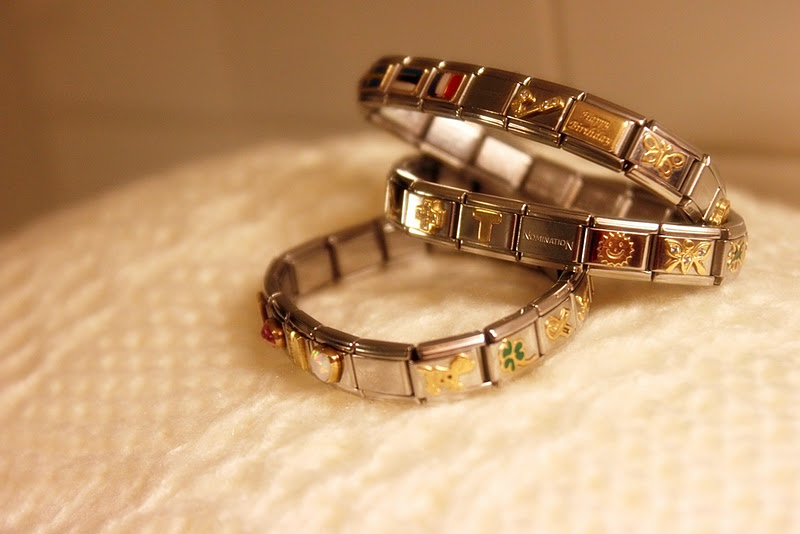 Nämä Nomination-rannekkeet ovat varmaankin tällä hetkellä arvokkaimmat koruni, sekä rahassa että tunnearvossa mitattuna, enkä uskalla edes kuvitella, miltä tuntuisi jos ne häviäisivät. Tärkeät vuosien varrella tapahtuneet ilot, surut, kokemukset ja muistot on koottu pala palalta näihin persoonallisiin rannekkeisiin. Pienen linnun ostin koruun, kun hyvä ystäväni menehtyi keväällä, Ranskan lipun sain äidiltä unohtumattoman matkamme jälkeen, T-kirjain muistuttaa menehtyneestä isoäidistäni ja kirjaimet C & C muistuttavat minua rakkaimmasta harrastuksestani, blogistani. Jokaisella palalla on tarinansa kerrottavana.