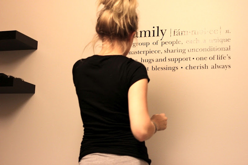 Ja sitten vuorossa on se jännin osuus. Kun eteisen tarran kiinnittäminen oli niin hankalaa kolmen ihmisen voimin (tai sitten me kolme oltiin vaan aivan liian kovaäänisiä kaikki!:D), päätin suoriutua makuuhuoneen tarrasta yksin. Tarra tulee irrottaa kulmasta aloittaen viistossa kulmassa, koko ajan huolehtien siitä, että kukin kirjain jää paikoilleen. Itse jouduin toisin sanoen vielä tässäkin vaiheessa hankaamaan pyyhkeellä tarraa kohta kohdalta kalvoa pois vedettäessä.