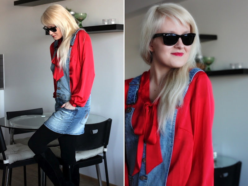 H&M:n sivuilla esillä ollut kevätuutuus oli hieman omasta farkkuihanuudestani poikkeava ja shortsimallinen, mutta pääasia on, että se muistutti minua tästä hauskasta Onlyn farkkumekosta, joka on päässyt aivan liian vähälle käytölle viime aikoina. Päivän rento ja tyttömäinen look toi mukavaa vaihtelua yleensä kovin pelkistettyyn toimistolookkiini. Työpäivän ajan farkkumekon kaverina toimi musta pitkähihainen, mutta innostuin vielä illemmalla testailemaan kotona, miltä mekkonen näyttäisi kirkkaan punaisen GT:n paitapuseron kera.
