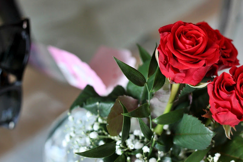 Ehkäpä inspiraatiota tuon punaisen puseron testailuun antoivat myös nuo hurmaavan punaiset ruusut, jotka odottivat keittiön pöydällä tultuani töistä kotiin. Onnea Noora ja Matti 3 v.! ;)