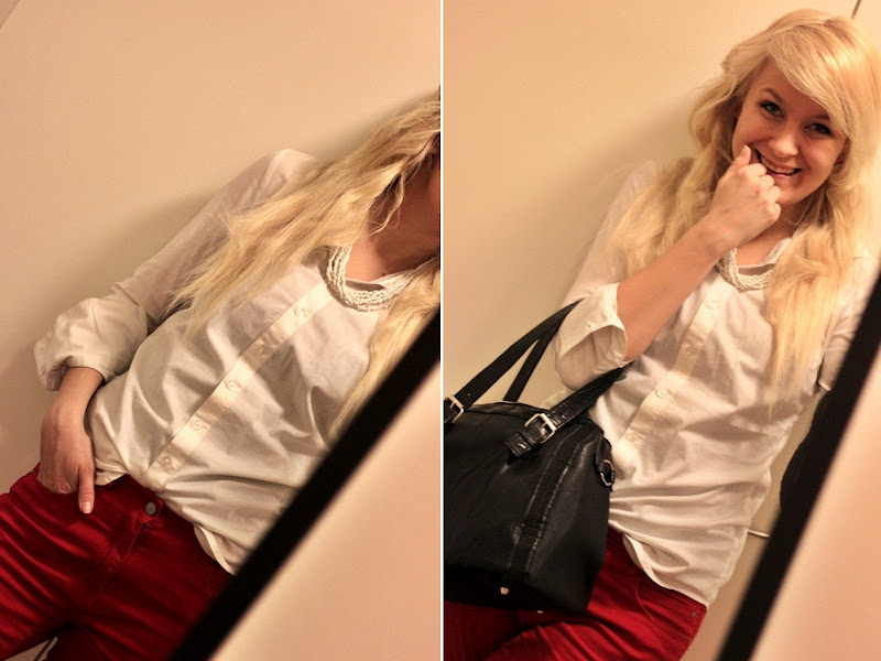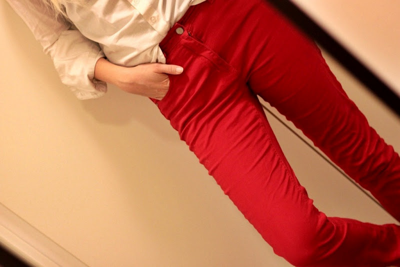 Mikään vaatekappaleeni ei ole varmaankaan koskaan kerännyt niin paljon kehuja ja kommentteja kuin rakkaat punaiset Vero Modan farkkuni. Pähkäilin niiden ostamista kauan; punainen väri on ollut minulle aina hieman vieras ja jopa pelottava tuttavuus, en oikein ole tuntenut oloani siinä kotoisaksi, ja sen vuoksi punaista ei vaatekaapissani juuri ole näkynytkään. Ennen punaisia farkkujani siis..