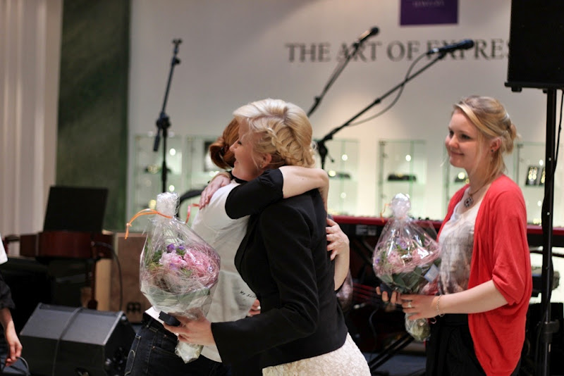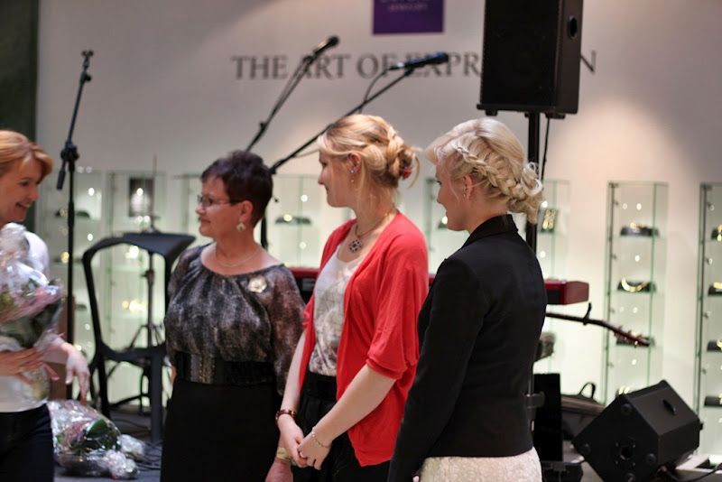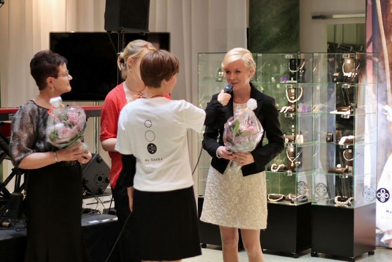 Paikalla oli mukavasti väkeä ja yleisöä viihdytti hurmaava Olavi Uusivirta. Paikalla oli myös kaksi muuta suunnittelijavoittajaa, ”Sinisiipi”-helan suunnitellut Jennifer ja ”Susi”-helan suunnitellut Airi. Taiteilijakappaleiden ja kukkien luovutuksen yhteydessä Kalevala Korun markkinointipäällikkö Marika Jirout sekä tuotepäällikkö Mari Kotka esittivät myös muutamia kysymyksiä heloistamme ja muun muassa niiden ideoinnista. Tilaisuus myös videoitiin ja kyseisen taltioinnin pitäisi ilmestyä piakkoin Kalevala Korun Facebook-sivulle!! ;)