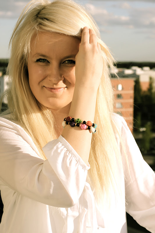 Tuuli pörrötti kisakampauksen sekaisin, mutta rentoon illanviettoon valittu asuni toimitti kunniakkaasti virkaansa loppuun asti. Asu on lähes kokonaisuudessaan koottu yhteen marketista löytyneistä vaatekappaleista. Tuo valkoinen pitkä paitapusero rusettikoristeella (Impuls) tuli eteeni ruokaostoksilla Citymarketissa, ja löytyipä eräästä alerekistä jokin aika sitten myös viidellä eurolla nuo varsin kivanväriset farkkulegginssit. Rannetta koristivat hirvittävän ihanat H&M:n Fashion Against AIDS-rannekorut.