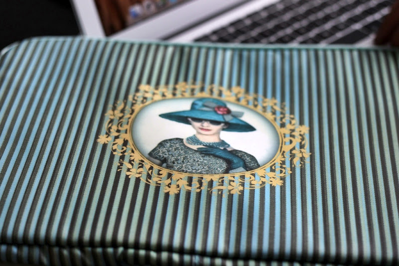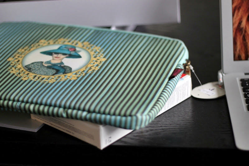 Vaikka asiansa osaava myyjäsetä kovasti yritti vakuuttaa, että tarvitsisin koneelleni mitä tylsimmän näköisen suojan, pidin pääni ja kassalle päätyi tuo ihana vintagehenkinen mintunvihreä kaunokainen. Enpä juuri tuon parempaa suojapussukkaa koneelleni voisi kuvitellakaan; se sopii kuitenkin niiin täydellisesti bloggailevan muotifriikin ajatusmaailmaan.