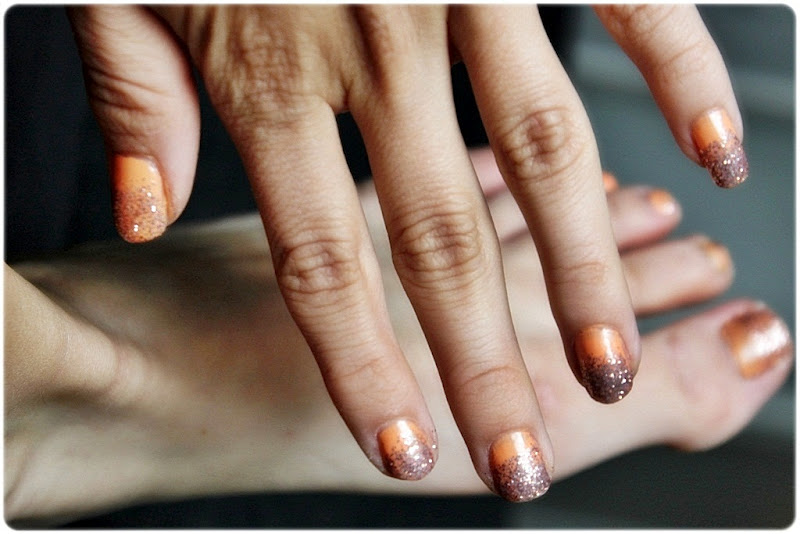 Pohjalle laitoin siis Mavalan Fresh Melon-lakkaa, ja sen kuivuttua, lisäsin puoleen kynteen kevyesti hileitä. Odotin hileiden kuivumista ja sudin vielä pari kerrosta lisää hileitä kynnelle. Tarkoituksena on siis tehdä hileillä kynteen liukuvärjäyksen kaltainen lopputulos, eikä levittää niinkään tasaista paksua kerrosta hileitä vain kynnen kärkeen.