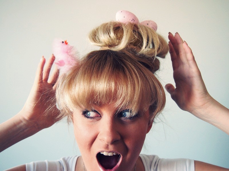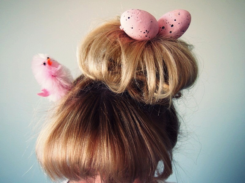 Välillä saa ja pitää hieman hullutella, ja kun isoisäni syntymäpäivälahjaa varten kävin Tiimarista hieman hakemassa eilen oheisia pääsiäisrekvisiittoja, oli minun suorastaan pakko toteuttaa tämä ”pesälook”, kun idea päähäni näiden pinkkien ihanuuksien kautta pälkähti. Sivunuttura valkin avulla, muutama Rapunzel of Swedenin-klipsipidennys mukaan, jotta pesästä tulee mahdollisimman muhkea ja toki ne olennaisimmat, tiput ja munat. Halutessaan nutturasta voi toki jättää munat ja tiput pois, mutta kuka nyt niin tylsä haluaisi pääsiäisenä olla.. ;)