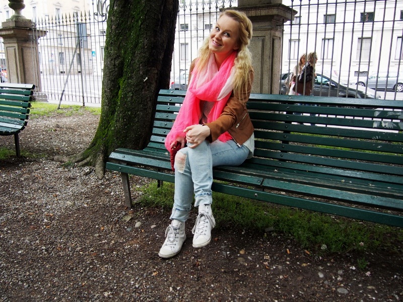 Otteluasu ei ollut ihan noin freshin näköinen kuin mitä kuvat antavat ymmärtää; kikkurat suoristuivat vesisateessa jo ennen kuin päästiin hallille ja kylmyyden vuoksi Matti osti minulle matkamuistoksi AC Milanin huivin ja lippiksen, että ihan tyylikkäänä oltiin sitten liikenteessä. Takki on kuitenkin tuliainen minulta minulle, löysin sen Stradivariuksesta ja rakastuin päätä pahkaa.