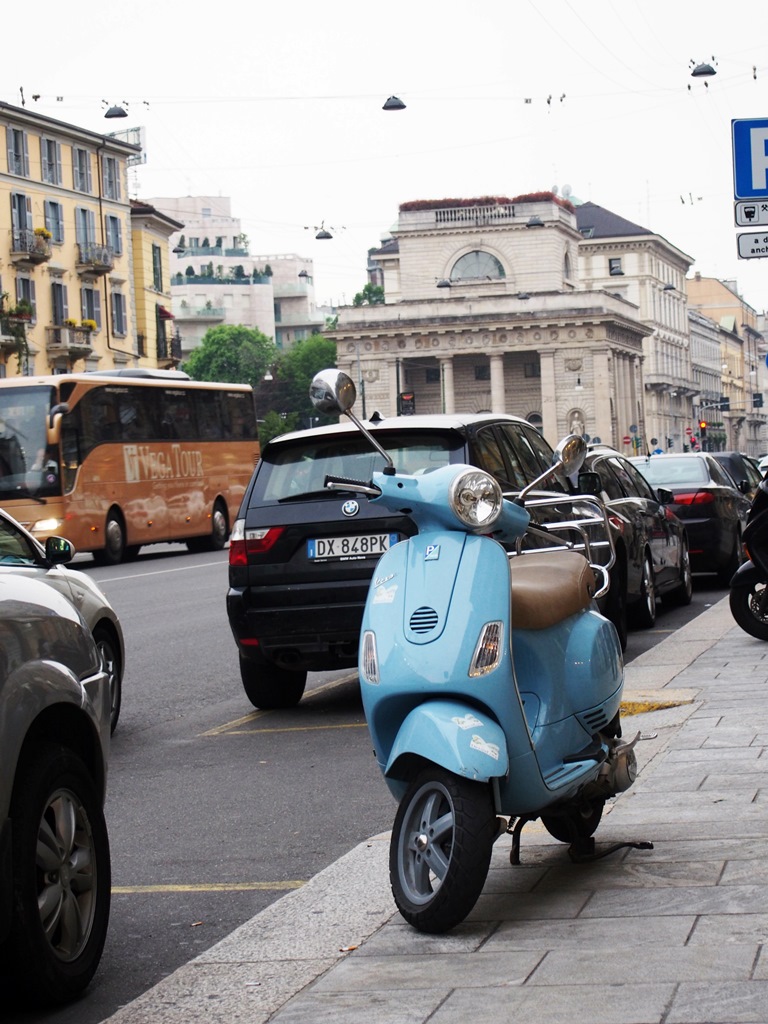 Milanossa olisi skootteri saattanut karata käsistä melko helpostikin, jos lompakko olisi ollut pullollaan tuhlattavaa matkakassaa. Hotellimme, Hotel Cristoforo Colombo sijaitsi Corso Buenos Airesilla, joka on pullollaan toinen toistaan houkuttelevampia paikkoja viettää hetki rankkasateilta piilossa. Olin kuitenkin jo Suomessa päättänyt, että tällä reissulla olen maltillinen shoppailija; ostaisin jotakin, joka pääsisi taatusti aktiiviseen käyttöön.