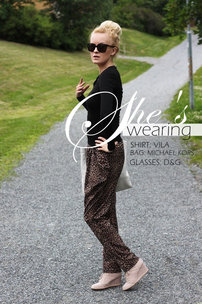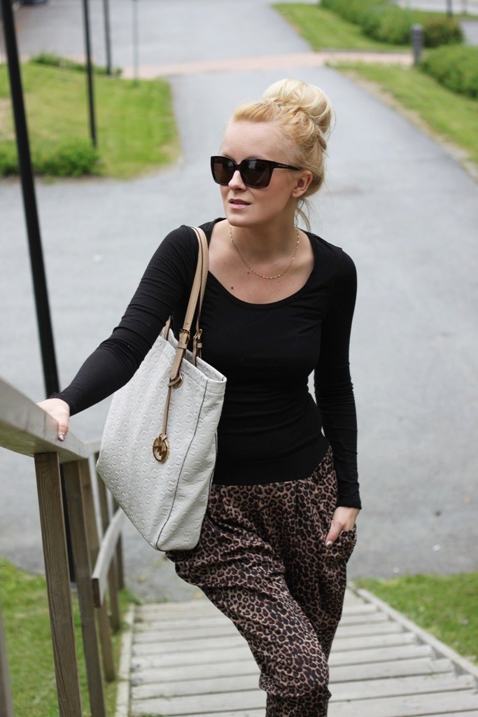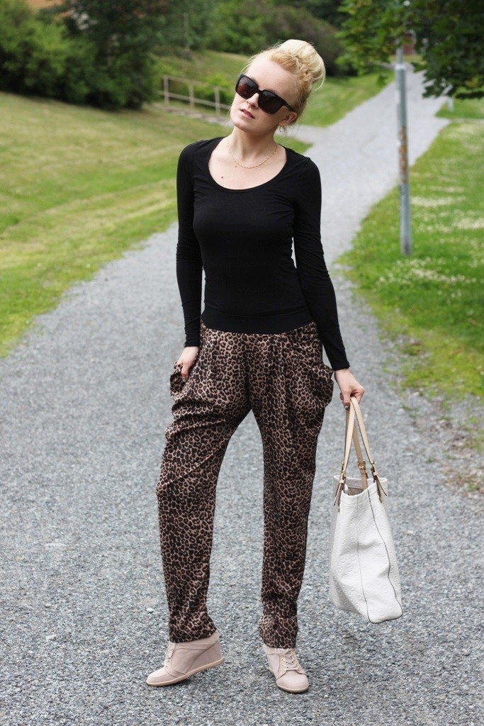 Olin jo niin epätoivoinen leopardipöksyjen metsästäjä, että ostin housut, vaikka koko olikin minulle paria numeroa liian suuri. Olen melko laiska vaatteiden tuunaaja, mutta nämä pöksyt pienensin heti kotiin päästyäni ja lopputuloksesta tuli erinomainen. Vyötärö istuu nyt nätisti ja housujen ”pussitus” tekee niistä rennon näköiset. Kireämmän yläosan kanssa tämä kombo toimii niin arjessa kuin muissakin menoissa. Kultaisten asusteiden kera tällä lookilla voisi kissanaisena hipsiä vaikkapa kaupungillekin. Jäin tosin vielä miettimään, pitäisikö housujen puntteihin ommella kuminauhat, jotta housut laskeutuisivat nätisti esimerkiksi kiilakorkolenkkareideni kanssa..
