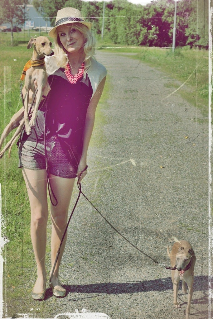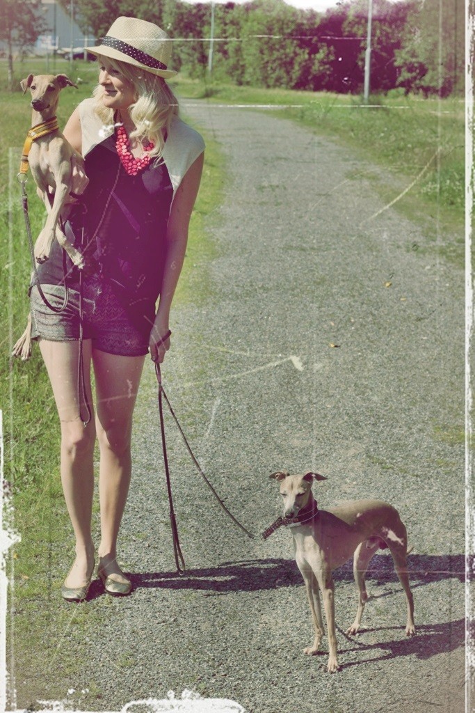 Aurinkoinen sunnuntai ajoi meidät ulos lauman kera- itse koen lähes huonoa omaa tuntoa siitä jos nökötän sisällä sohvan pohjalla, kun ulkona paistaa aurinko. Niinpä lähdimmekin nauttimaan kesäkeleistä ulos joukoittain, kun mukana oli jos jonkinlaisia vipeltäjiä. Tästä jengistä ei voi kyllä olla kuin tykkäämättä; yksi ei pitkine koipineen mahdu syliin, yhden tupsukorvat ovat kyllä aivan omaa luokkaansa ja kolmas askeltaa kuin pikkuinen hevonen muiden matkassa. Yritä nyt sitten tälläistä laumaa pitää kurissa.