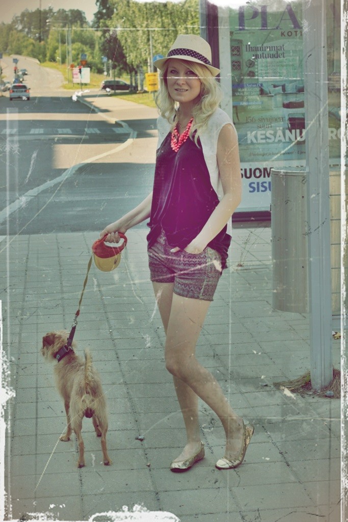 Asu oli muutenkin hieman ex tempore-malliin koottu. Hattuhyllyltä nappasin ulos Matin hatun, ylle pääsi jo kuukausi sitten ostetut H&M:n shortsit ja tuo ihanan rento pusero oli löytö Zaran aleista taannoiselta Helsinki-visiitiltä. Shortseista löytyy myös hieman pinkkiä, joten kaulaan laitoin tuon näyttävän H&M:n kaulakorun.