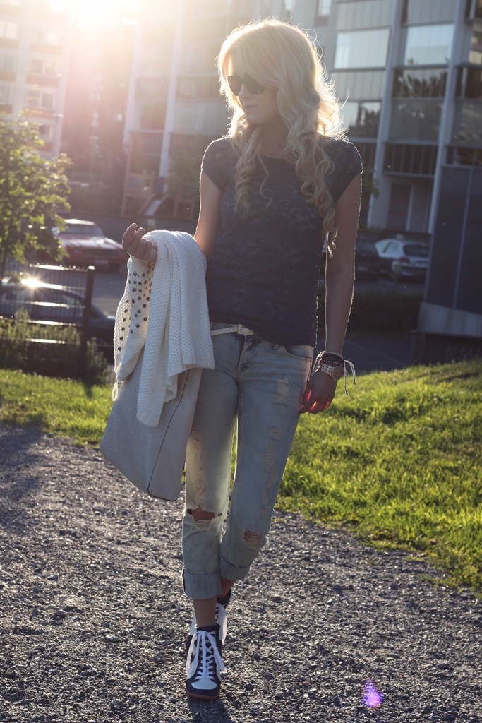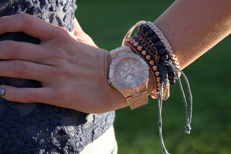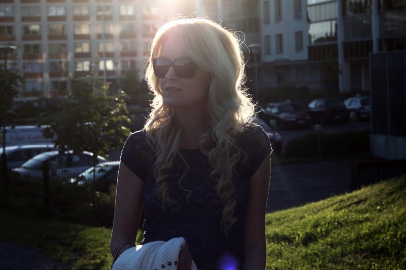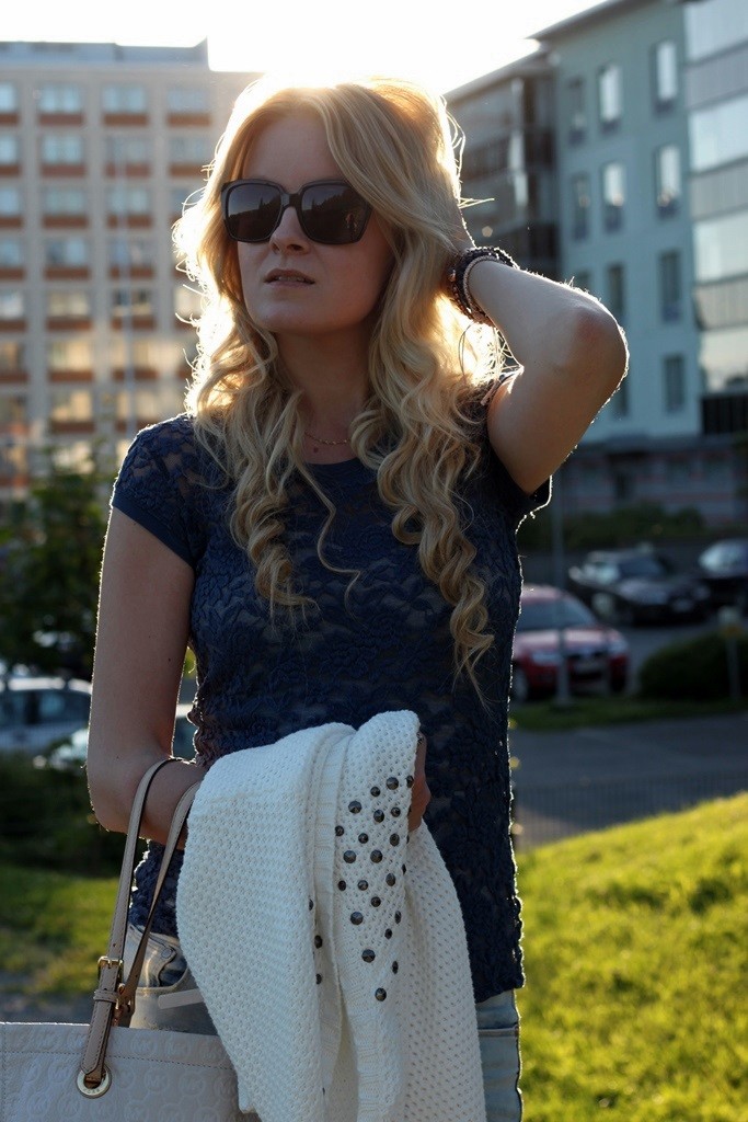 // Good morning everyone! We enjoyed the beautiful sumemr day here in Finland yesterday and I decided to wear some of my favourite clothes and accessories. Blue color is my all-time-favourite when it comes to clothes, and in my opinion, that gorgeous lace shirt looks beautiful with my boyfriendjeans. And finally, finally I found some cute rosegold bracelets from Lindex, don’t they look so good together with my Guess-watch!