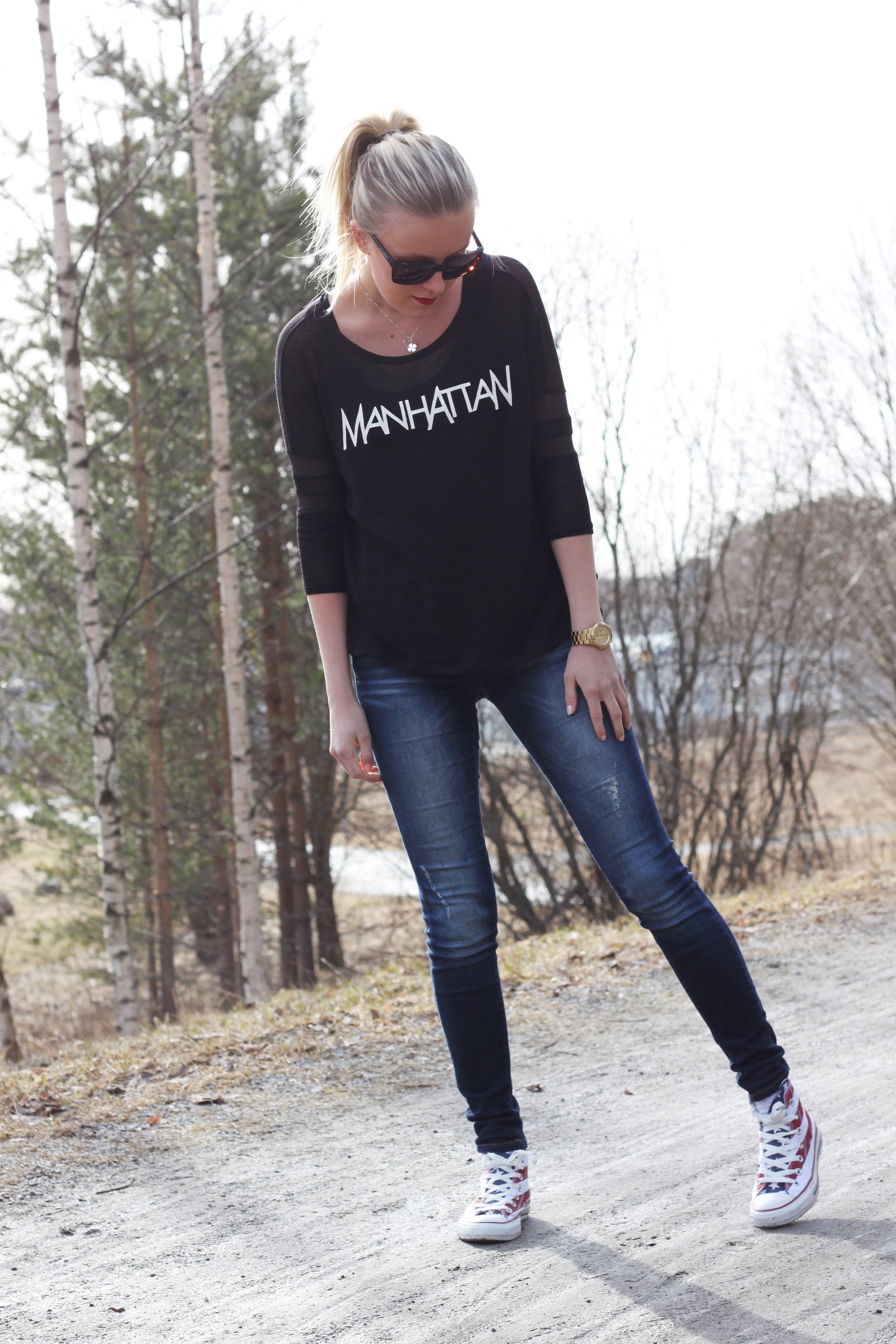 Liekö syynä sitten kaipuu New Yorkiin vaiko vain puhdas ihastuminen erinäisiin vaatekappaleisiin, mutta vaatekaappiini on viime aikoina eksynyt paljon kyseisestä maasta ja paikasta muistuttavia tavaroita. Viimeisimpänä löytönä hankin itselleni alennusmyynneistä huikean makeet Converset muutamalla kympillä Nellyltä. Ehkä ne kuljettavat minut vielä joskus takaisin New Yorkin vilinään..