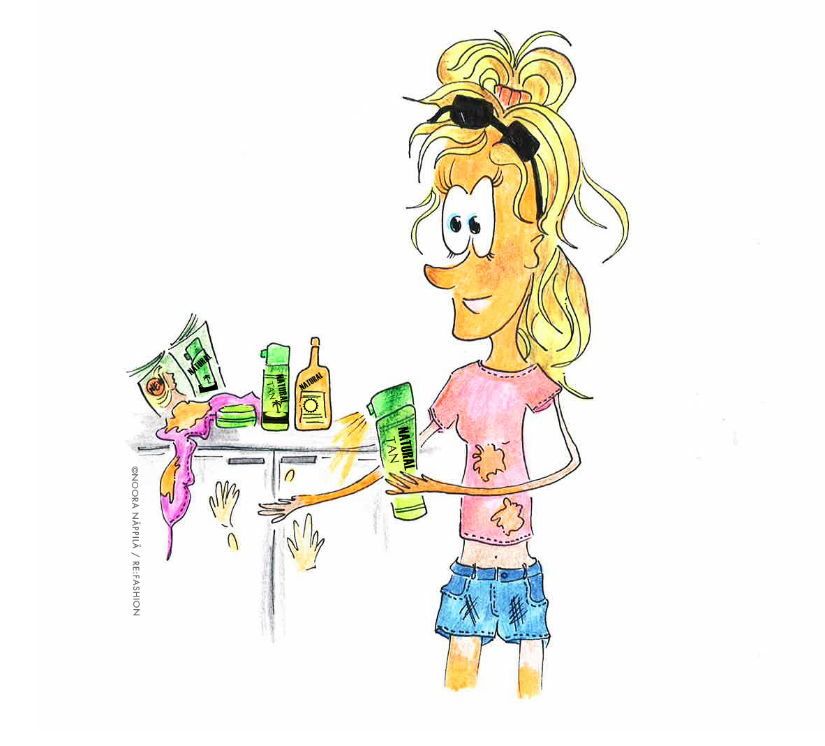 // Pirkko received some selftanningproducts as a gift. A big mistake, a big mistake.