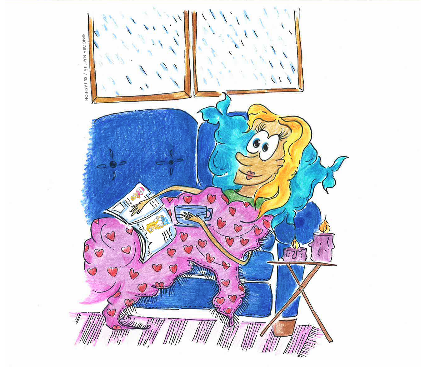 ”Ja nyt, kesäsateen ropistessa ikkunan takana, minä käperryn viltin alle höyryävän teekupposen kanssa lukemaan juuri postiluukusta alas kolahtanutta Trendiä/ Oliviaa/ Costumea/ Elleä kynttilänvalossa.”